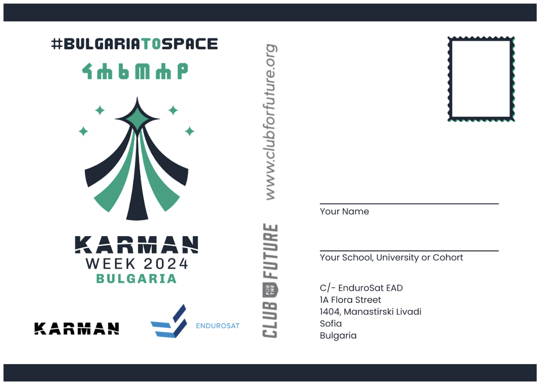 In September 2024, The Karman Project designed and printed 300 co-branded postcards for Karman Week, hosted in Bulgaria. Postcards were distributed to Bulgarian youth through The Karman Project’s local partner, EnduroSat.