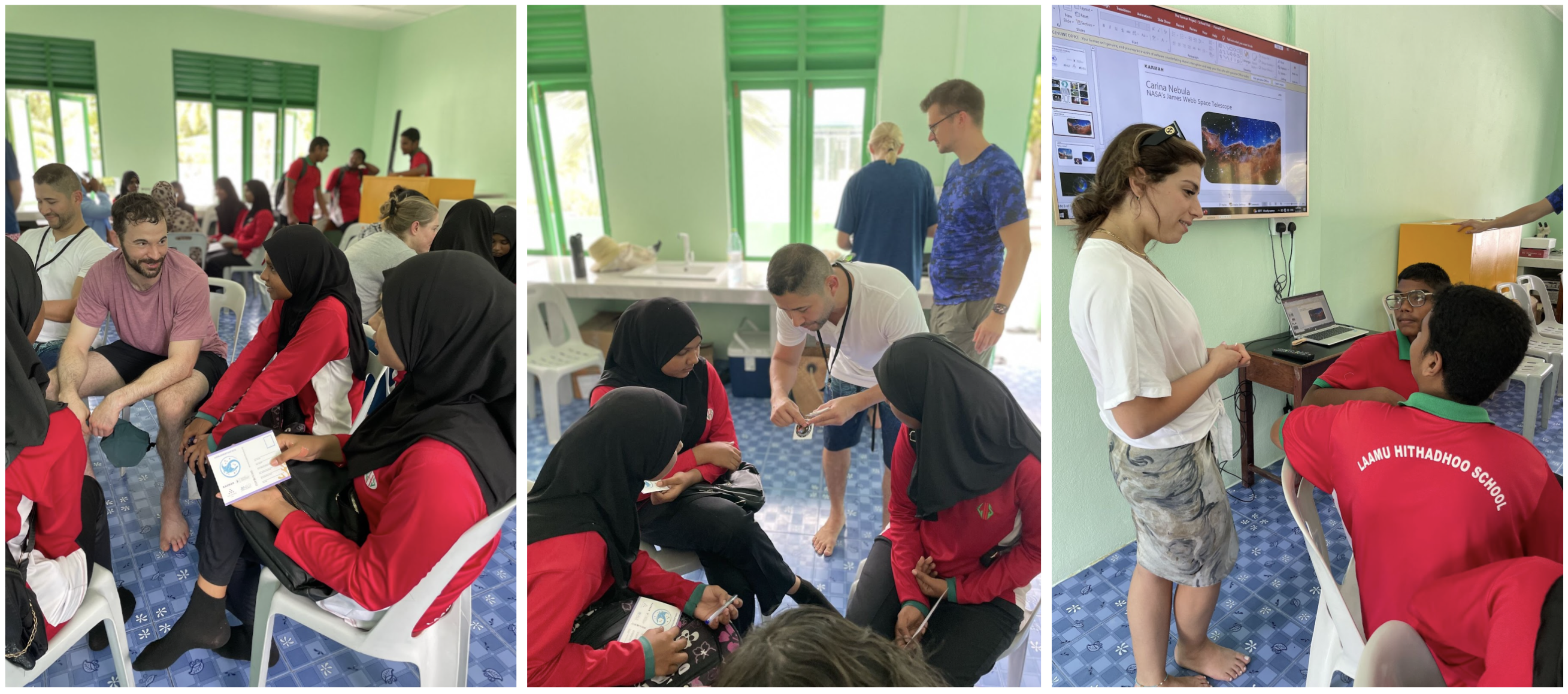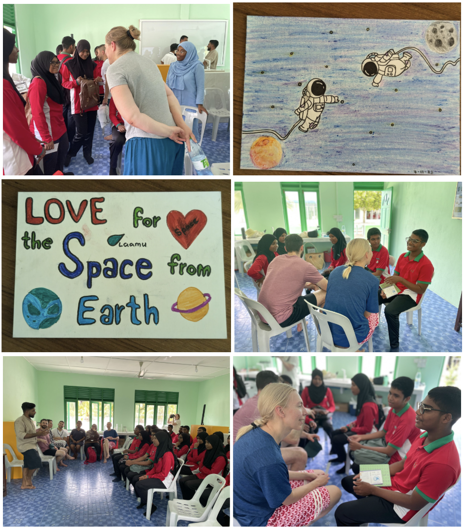 In November 2023, The Karman Project designed, printed and distributed 200 co-branded postcards for Karman Week, hosted in Maldives. Postcards were distributed to Maldivian youth at the Hithadhoo Primary School, located on a remote island in the Laamu Atoll, with The Karman Project’s local partners Maldives Space Research Organisation and the Maldives Underwater Initiative.